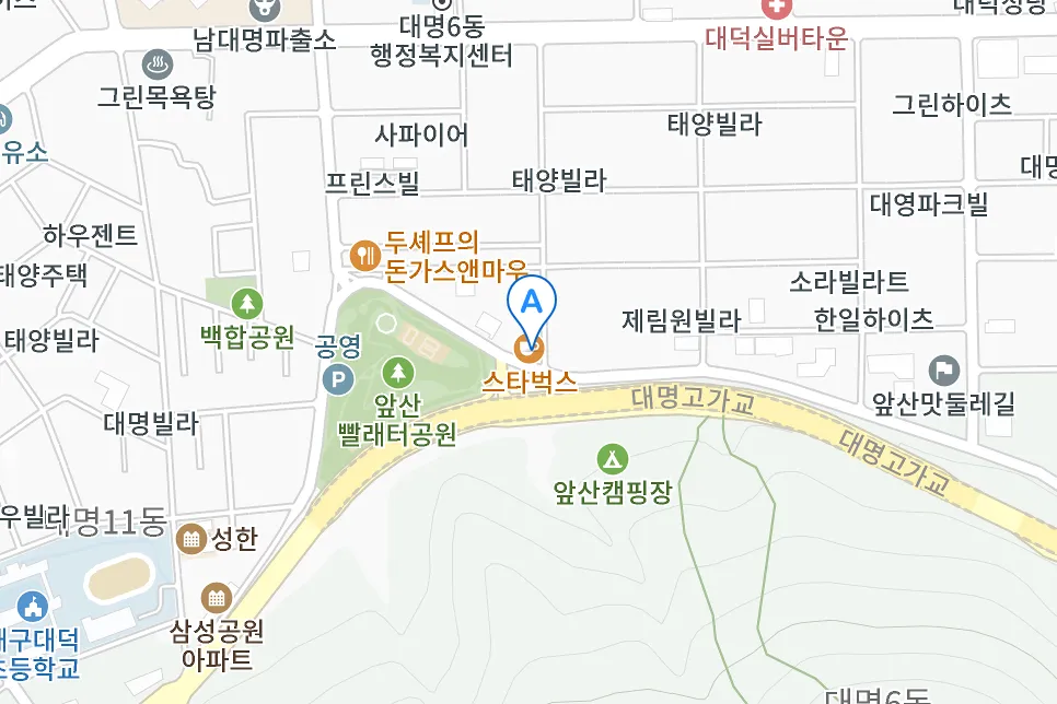 ▷스타벅스 대구 앞산스카이타운점 위치 : 대구 남구 앞산순환로 375 (우) 42495 지번대명동 585-4