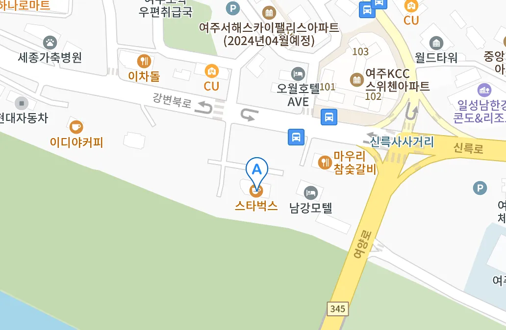 ▷스타벅스 여주남한강 DT점 위치 :경기 여주시 강변북로 11 (우) 12639 지번천송동 565-8