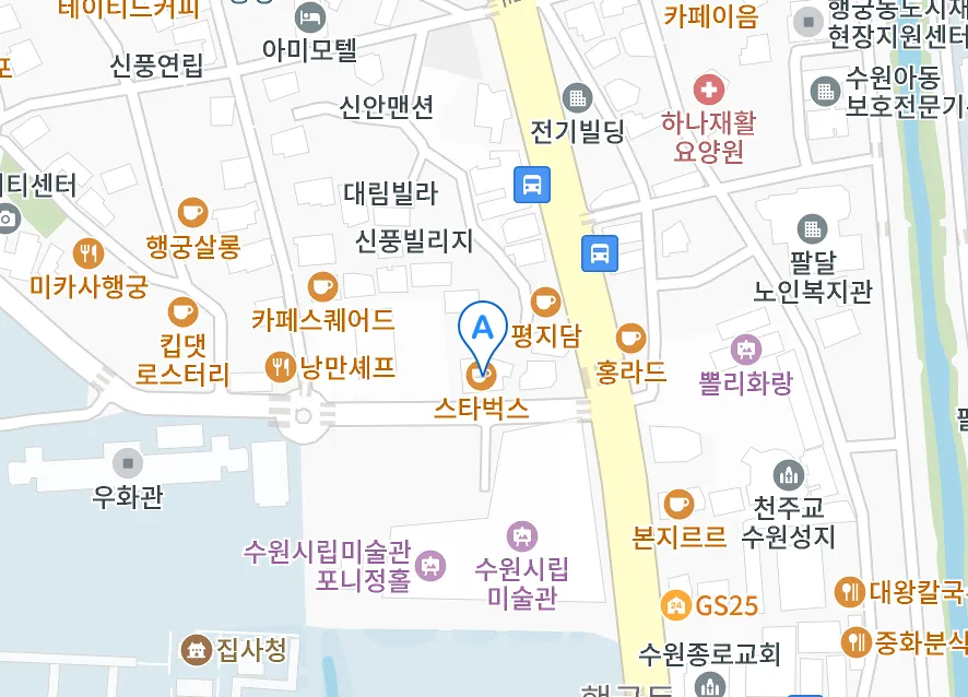 ▷스타벅스 수원화성행궁점 위치 : 경기 수원시 팔달구 정조로 841번 길 10 1,2층 (우) 16252 지번신풍동 224