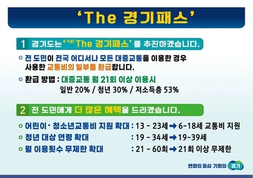 지역에 상관없이 월 15회 이상(최대 60회) 시내버스나 지하철 등 대중교통을 이용하는 국민이라면 대중교통비용으로 지출한 금액 중 일정 비율로 환급을 받을 수 있는 패스권입니다.